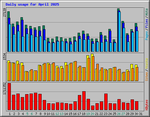 | Day | Hits | Files | Pages | Visits | Sites | KBytes | ||||||